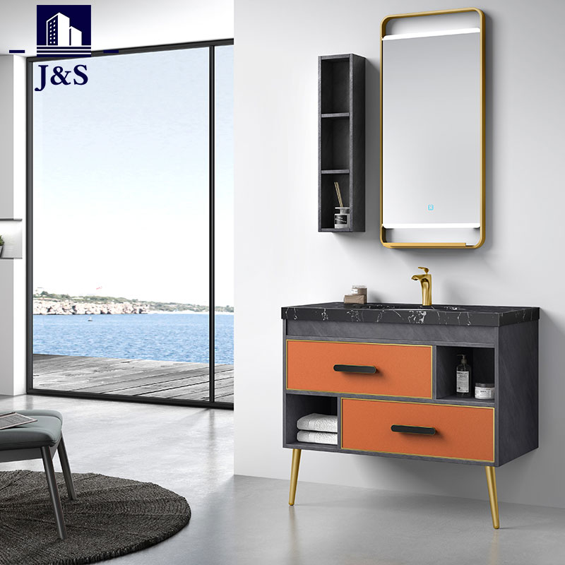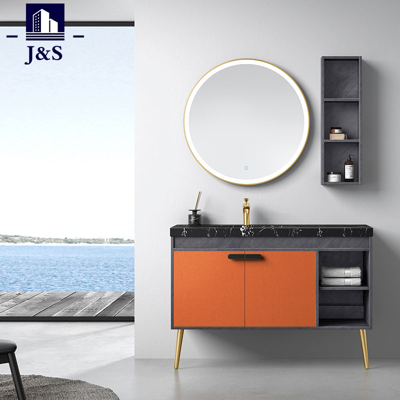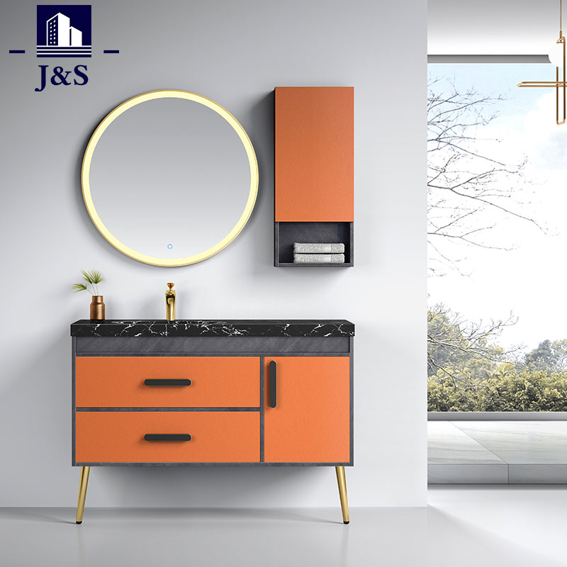 आम्ही फ्लोअर स्टँडिंग बाथरूम कॅबिनेट बाथ व्हॅनिटी पुरवतो. हे सोनेरी हँडल डिझाइनसह केशरी रंगाचे बाथरूम व्हॅनिटी आहे, विशिष्ट आणि फॅशनेबल.