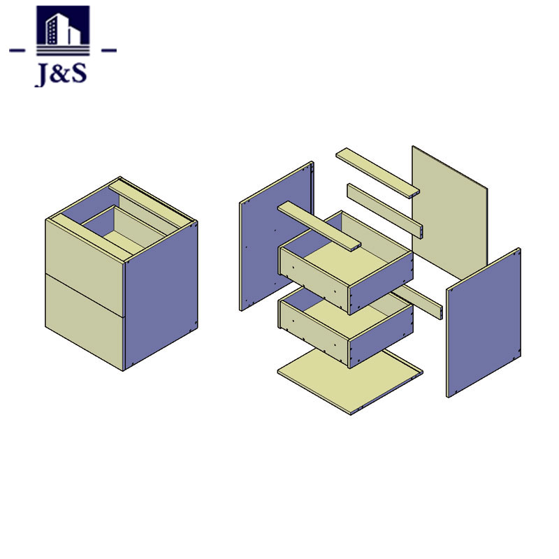 फ्लॅट पॅक किचनचा वापर पार्टिकल बोर्ड, बॉक्समध्ये पुरवठा, बिजागर, स्क्रू, कॅम लॉक, डोव्हल्स आणि इतर संबंधित हार्डवेअरसह पॅक करण्यासाठी केला जातो.