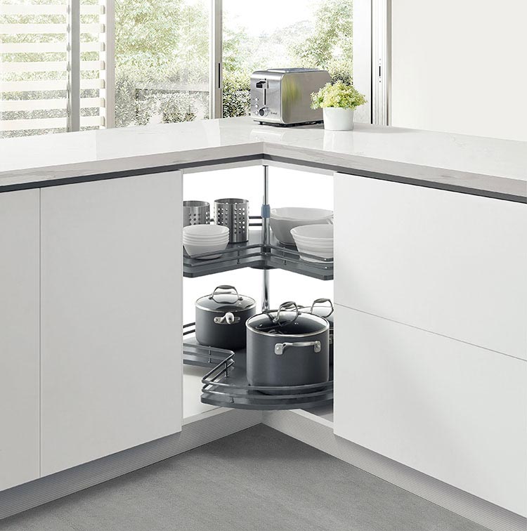 स्टोरेज किचन सोल्यूशन मॅजिक कॉर्नर कॅबिनेट वापरण्याच्या पद्धतीनुसार दोन प्रकारांमध्ये विभागले गेले आहेत: एक पुल-आउट प्रकार आहे. ही कोपरा पुल-आउट बास्केट दरवाजाच्या पॅनेलसह एकत्रितपणे बाहेर काढली जाऊ शकते, ज्यामुळे जागेचा जास्तीत जास्त वापर होऊ शकतो आणि ते सोयीस्कर आणि व्यावहारिक आहे. गैरसोय म्हणजे स्थापना त्रासदायक आहे आणि किंमत जास्त आहे. दुसरा टर्नटेबल प्रकार आहे. टर्नटेबल कॉर्नर बास्केटची किंमत पुल-आउट कॉर्नर बास्केटपेक्षा खूपच स्वस्त आहे आणि रचना तुलनेने सोपी आहे. तोटा असा आहे की जागा वापरण्याचे प्रमाण कमी आहे, ज्यामुळे कचरा करणे सोपे आहे.