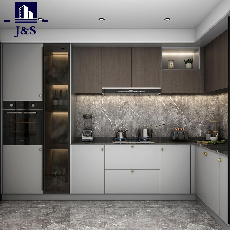 Unassembled लॅमिनेट होम किचन कॅबिनेट त्याच्या अग्निरोधक बोर्ड कॅबिनेटची मूळ सामग्री पार्टिकलबोर्ड किंवा MDF असू शकते, ज्याच्या पृष्ठभागावर लिबासचा थर असतो, ज्याला सध्या लिबास देखील म्हणतात. रेफ्रेक्ट्री बोर्डमध्ये पोशाख प्रतिरोध, उच्च तापमान प्रतिरोध, स्क्रॅच प्रतिरोध, प्रवेश प्रतिरोध, सुलभ साफसफाई आणि चमकदार रंग ही वैशिष्ट्ये आहेत, जी कॅबिनेट वापराच्या आवश्यकता पूर्ण करतात आणि स्वयंपाकघरातील विशेष वातावरणाशी जुळवून घेतात.