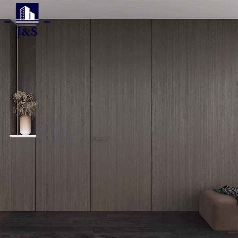होल हाऊस कस्टमाइज्ड हिडन डोअरचा हा संच प्रिमियम संपूर्ण घर सानुकूल डिझाइन दाखवतो, आधुनिक राहण्याच्या जागेत अखंडपणे मिसळून. दारे एक अत्याधुनिक गडद लाकूड ग्रेन फिनिश वैशिष्ट्यीकृत करतात जे गडद फ्लोअरिंग आणि कमीतकमी भिंतींच्या उच्चारांशी उत्तम प्रकारे सुसंवाद साधतात, जे अधोरेखित लक्झरीसह एकूण सौंदर्याचा दर्जा उंचावतात. ठळक वैशिष्ट्य त्याच्या उत्कृष्ट हार्डवेअरमध्ये आहे: स्लीक, भौमितिक दरवाजाच्या हँडलमध्ये अचूक तपशीलांसह मॅट ब्लॅक टेक्सचर आहे, आरामदायी पकड आणि औद्योगिक अभिजातपणाचा स्पर्श आहे. दरम्यान, हेवी-ड्यूटी हिडन बिजागर अत्यंत गुळगुळीत ऑपरेशनची खात्री देते आणि पूर्णपणे लपवून ठेवते, टिकाऊपणा आणि किमान कल्पकता या दोहोंना मूर्त रूप देते. शैली आणि कार्यक्षमतेच्या मिश्रणाचा पाठपुरावा करणाऱ्या तरुण घरमालकांसाठी तयार केलेले, हे डिझाइन दरवाजाच्या अडथळ्यांना दूर करते, एक खुले, अव्यवस्थित वातावरण तयार करते. आधुनिक अपार्टमेंटसाठी ही अंतिम निवड आहे, समकालीन जीवनाची पुनर्परिभाषित करण्यासाठी उच्च-गुणवत्तेच्या कारागिरीसह अखंड व्हिज्युअल एकत्रीकरण विलीन करणे.